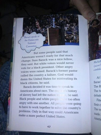 “But some people said Americans weren’t ready for that much change. Sure Barack was a nice fellow, they said. But white voters would never vote for a black president. Other angry voices were raised. Barack’s former pastor called the country a failure. God would damn the United States for mistreating its black citizens, he said.”