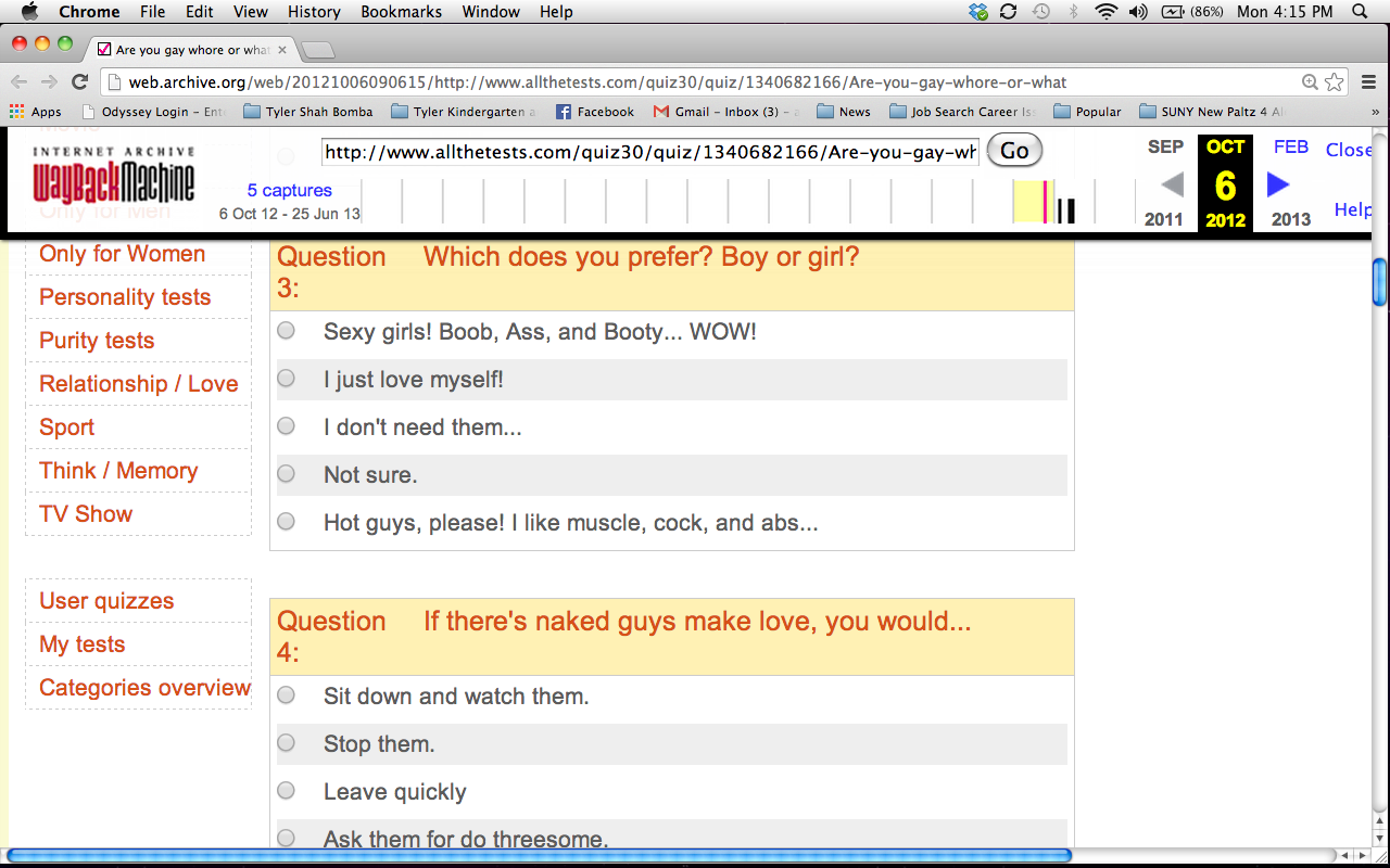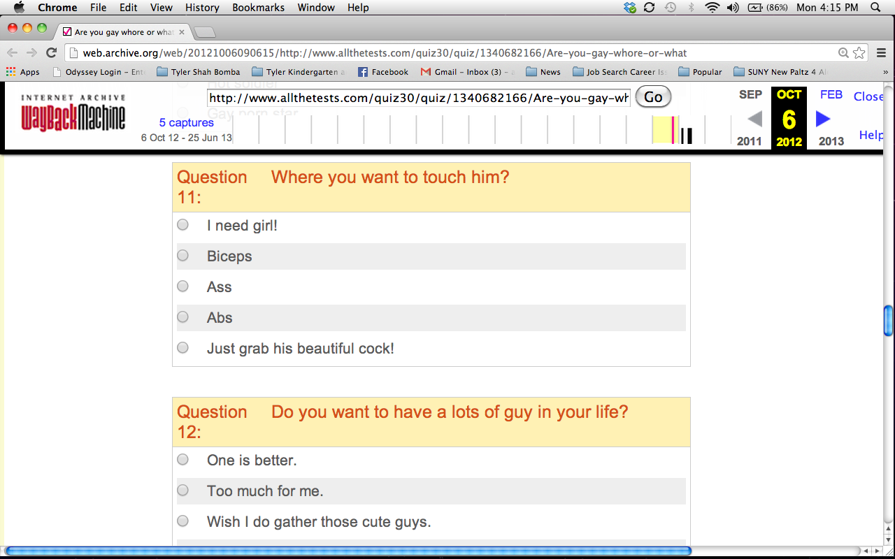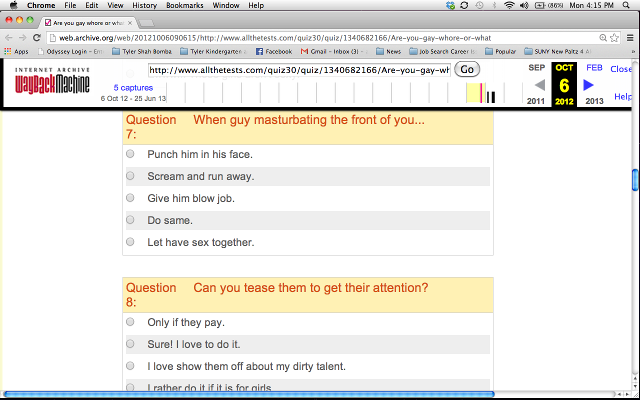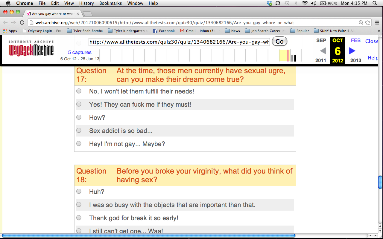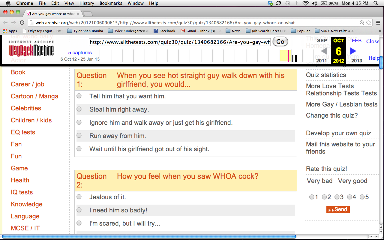 I took screen shots of the most disturbing quiz, the Man Whore quiz as you can see above. As to date, the captures state October 6, 2012- June 25, 2013 but it was created on the website in July 2012.