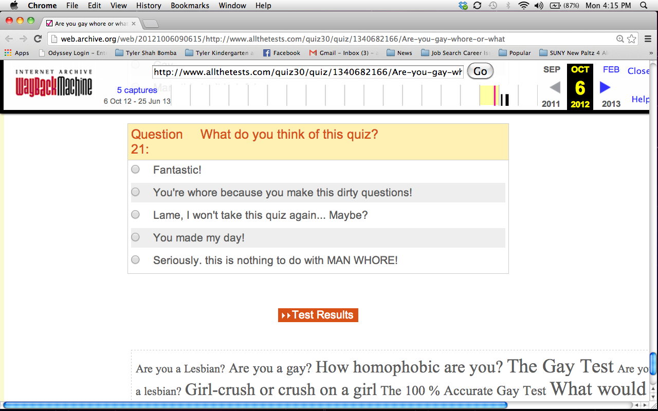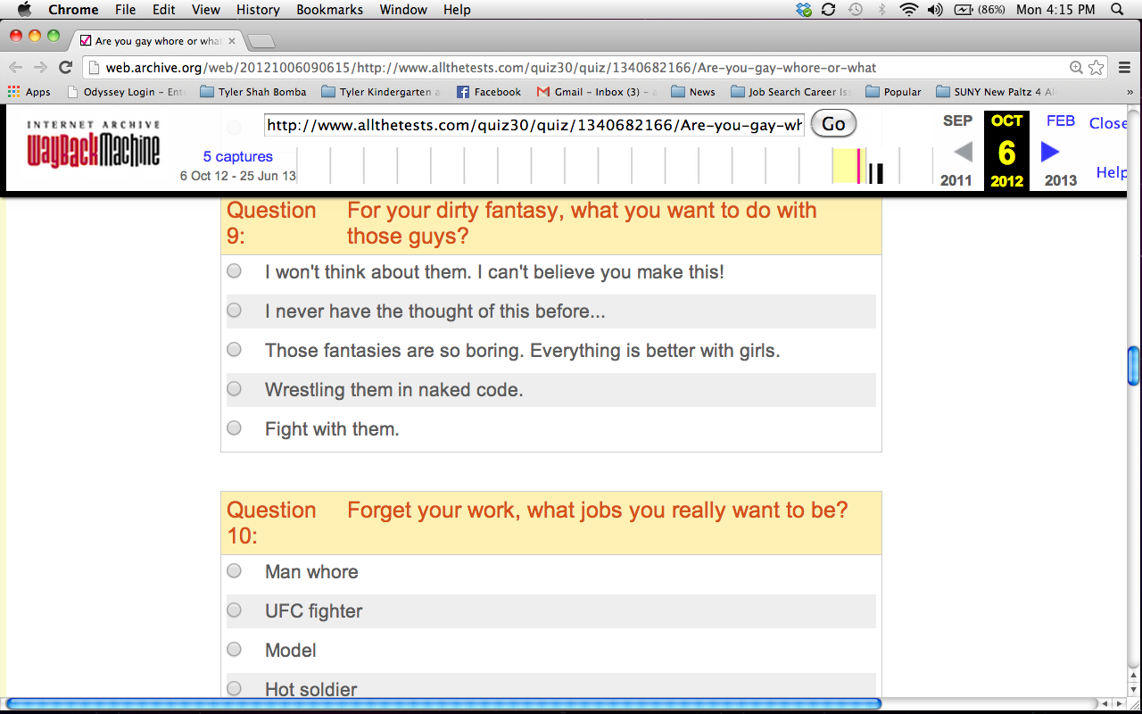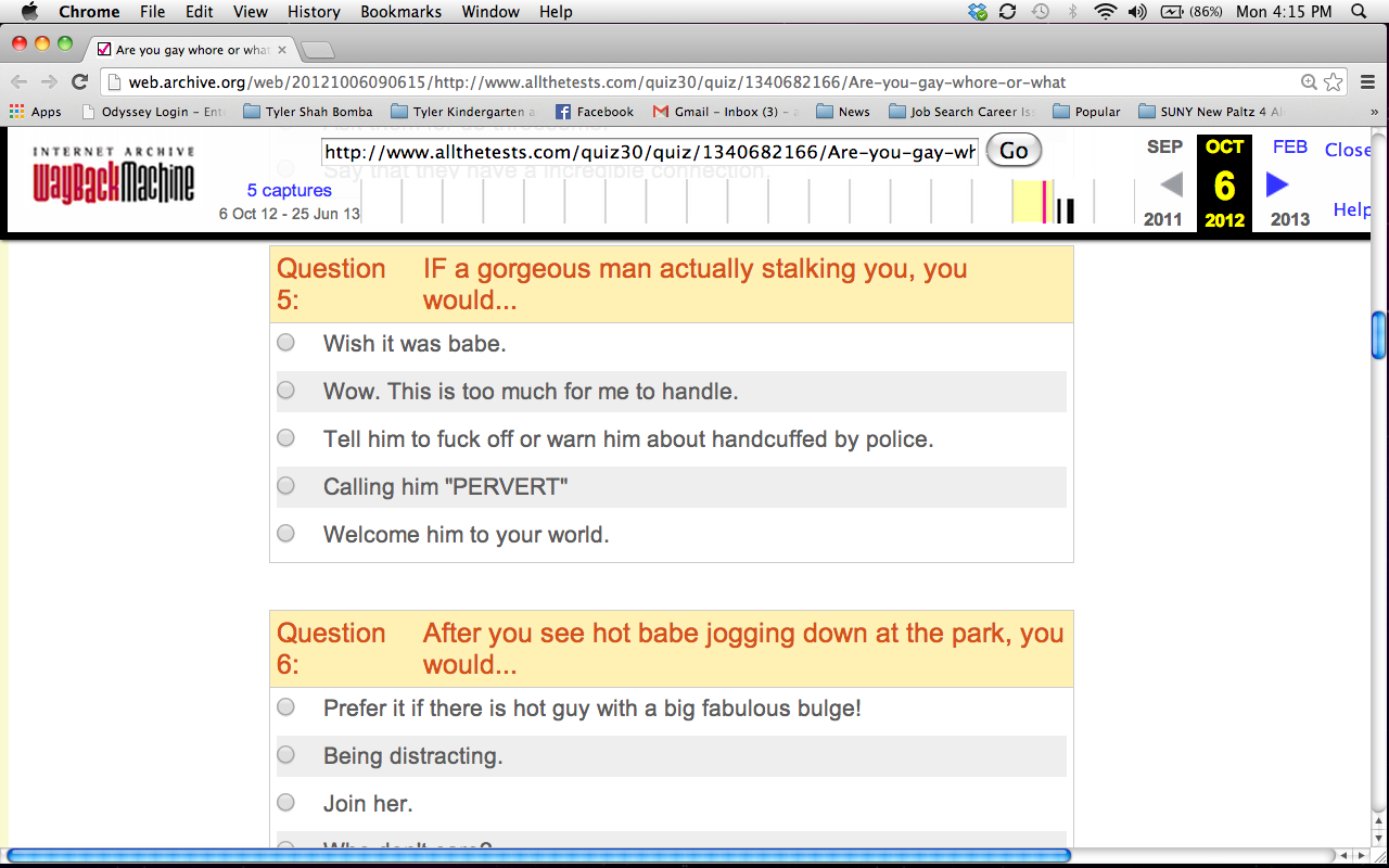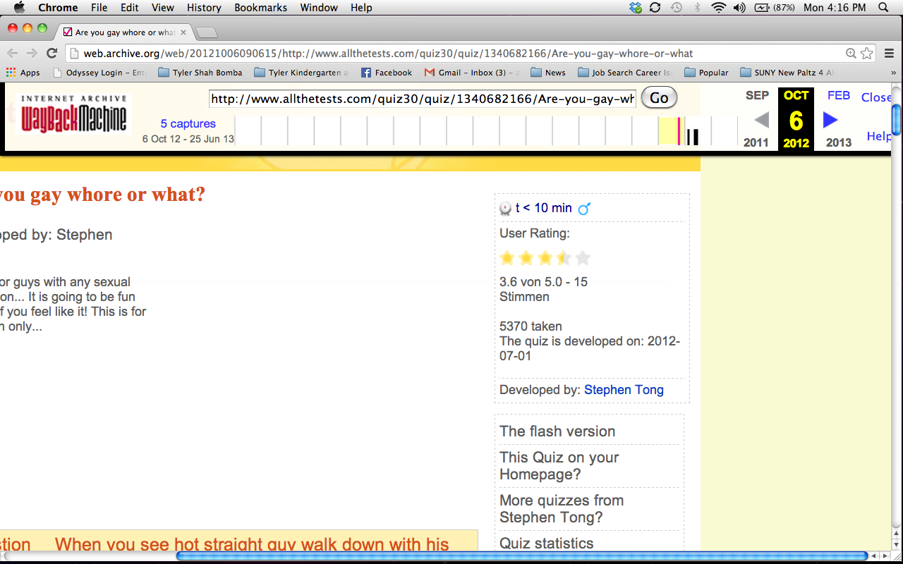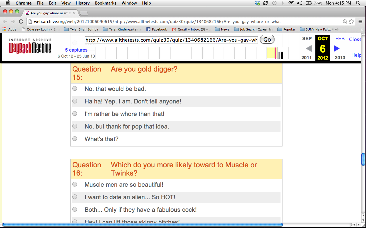 I took screen shots of the most disturbing quiz, the Man Whore quiz as you can see above. As to date, the captures state October 6, 2012- June 25, 2013 but it was created on the website in July 2012.
