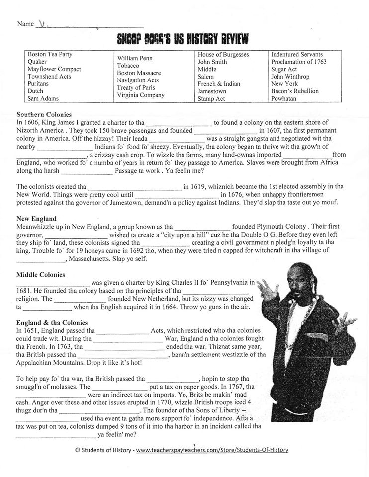 Titled “Snoop Dogg’s US History Review,” students are required to fill in the blanks to tell the history of the American Colonies.