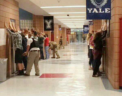 During my third period class the principal came over the intercom and announced that all teachers were to lock the doors and no one was permitted in the hall. I just thought maybe it was a random locker search with drug dogs because they have done that occasionally.