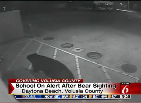 Surveillance video at the Volusia County, Florida school recently captured a large bear roaming the campus, looking for food.