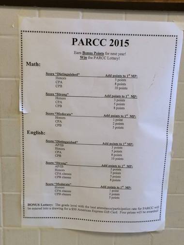 The district apologized this weekend for the fliers, which informed students they could earn bonus points for the next school year. The fliers also promised a lottery of $50 American Express gift cards for the grade level with the highest PARCC participation rate.