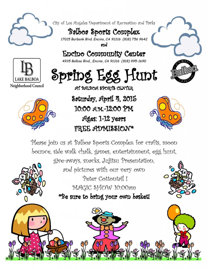 The City of Los Angeles Department of Recreation and Parks is sponsoring Saturday’s “Spring Egg Hunt.” The festivities include a moon walk, egg hunt, Jujitsu presentation and pictures with Peter Cottontail.