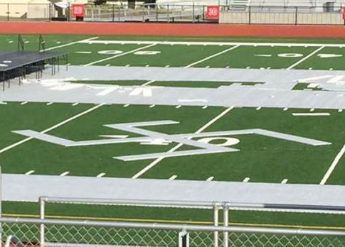 School administrators say someone reconfigured the protective tiles, on the field to protect it during graduation, into the symbol.