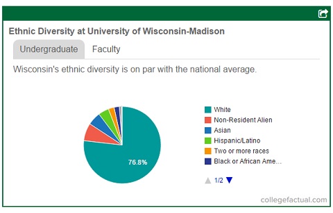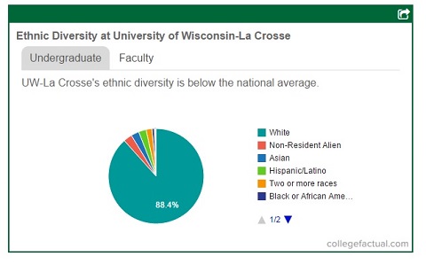 So how “diverse” is UW-La Crosse? The most readily-available numbers at the website, CollegeFactual.com say the school has “diversity” numbers similar to Wisconsin’s demographics.