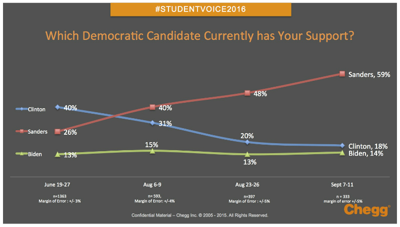 Support for the former Secretary of State among college students has plunged in the last two months, according to a new poll conducted by the textbook company Chegg.