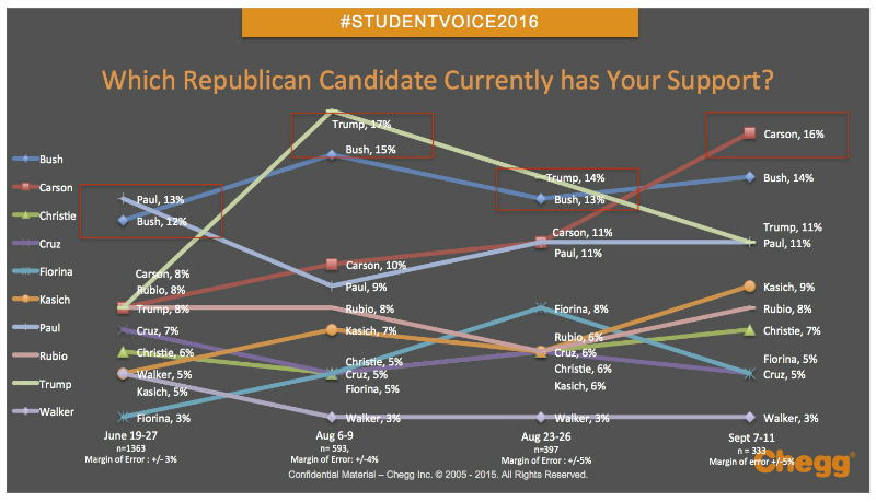 In June, Carson and Trump were both polling at 8 percent. To date, Trump peaked at 17 percent in August and has now fallen to 11 percent in September, tying Sen. Rand Paul for third. In the Chegg poll, Jeb Bush is in second with 14 percent of college students.