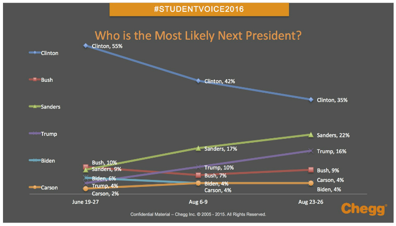 The aura of inevitability has also fallen significantly for Clinton. In June, 55 percent of college students believed Hillary was “most likely” to be the next president. Today, while still leading in that category, only 35 percent of students still believe it.