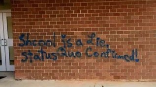 School officials told WYFF they discovered several messages spray-painted in blue on the building, a bus, and sidewalks when they arrived Tuesday morning, including one very ironic missive scrawled on a brick wall: “Shcool is a lie. Status Quo Confirmed!”