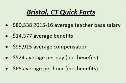 Bristol teachers work 181 days per year, and we will assume about eight hours per day. Using that schedule, the average salary breaks down to about $444 per day and about $55 per hour.
