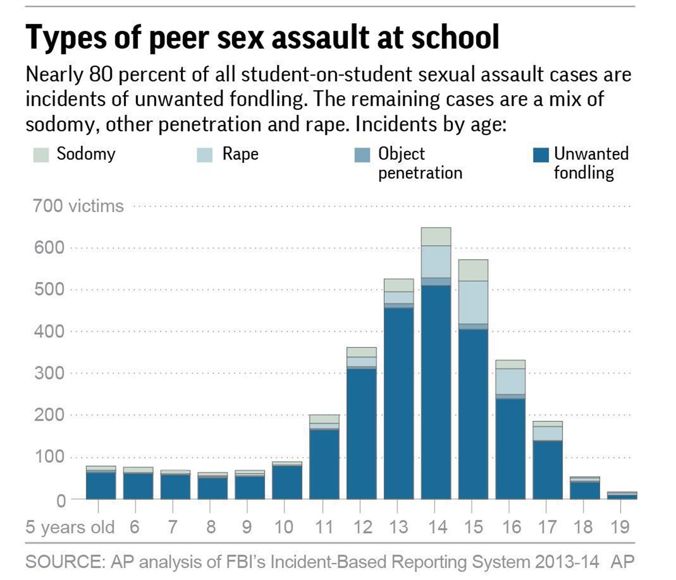 The majority of student-on-student sex assaults involve victims between the ages of 11 and 17, though about 5 percent of the cases involved 5- and 6-year-olds. The number of student victims increases from ages 11 through 14, then decline through high school.