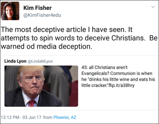 Deer Valley Unified School District board president Kimberly Fisher posted an article that called into question Trump’s understanding of religious denominations, along with her thoughts on the matter, The Arizona Republic reports.