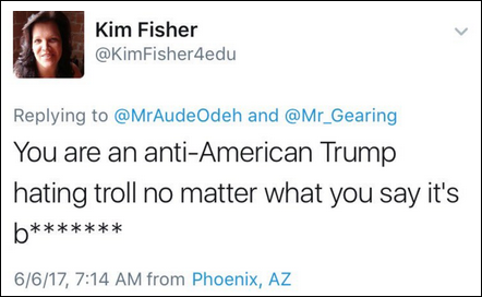 “Because you say so? B*******,” Fisher wrote. “You are an anti-American Trump hating troll no matter what you say it’s b*******.”